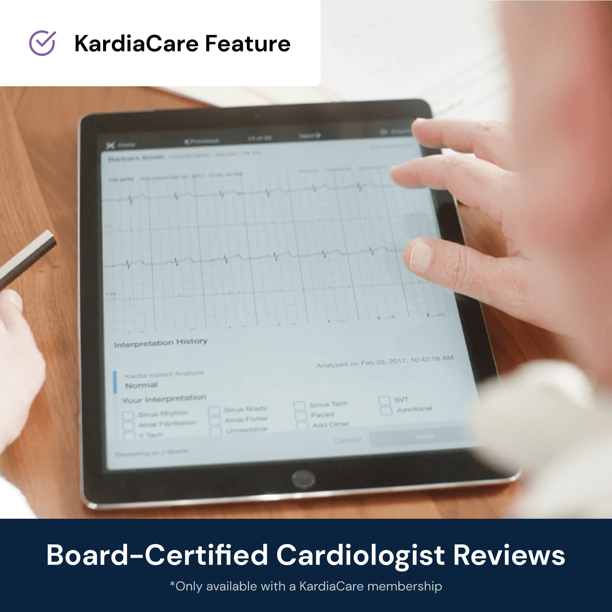 - Get cardiologist EKG reviews. Select an EKG to be reviewed by a board-certified cardiologist without leaving your home. Four reviews annually are included with your membership.* This feature is exclusive to KardiaCare.
